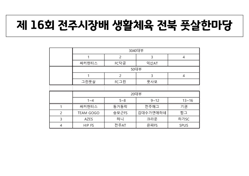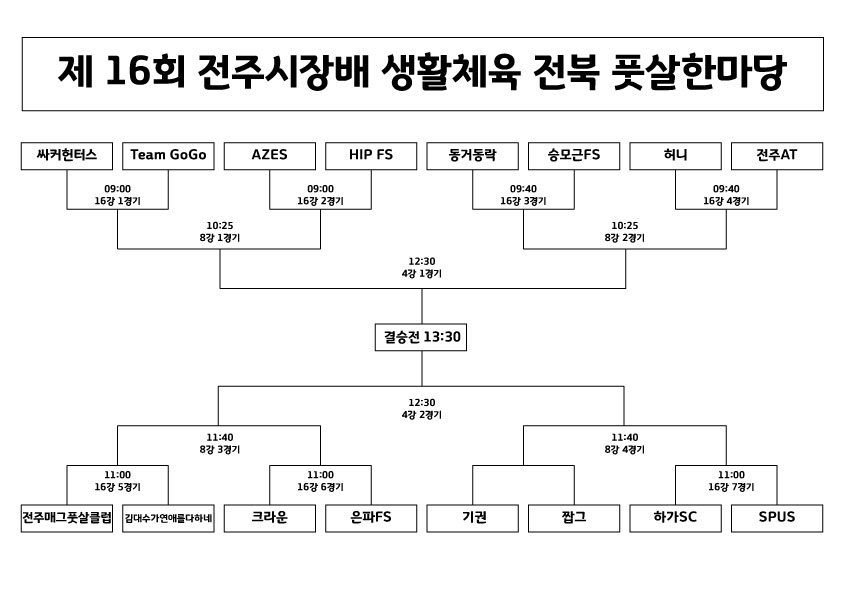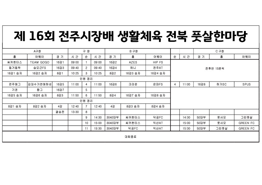 제 16회 전주시장배 생활체육 전북풋살한마당 대진표와 경기일정입니다. 작성자이슬옹|작성시간20.11.12|조회수330 목록 댓글 0 글자크기 작게가 글자크기 크게가 16회-전주시장배-전북풋살한마당-20대부-토너먼트.jpg50.24KB16회-전주시장배-전북풋살한마당-경기일정.jpg70.42KB16회-전주시장배-전북풋살한마당-조편성.jpg44.72KB 첨부파일첨부된 파일이 6개 있습니다. jpg 파일 16회-전주시장배-전북풋살한마당-조편성.jpg 다운로드 jpg 파일 16회-전주시장배-전북풋살한마당-20대부-토너먼트.jpg 다운로드 jpg 파일 16회-전주시장배-전북풋살한마당-경기일정.jpg 다운로드 jpg 파일 16회-전주시장배-전북풋살한마당-20대부-토너먼트.jpg 다운로드 jpg 파일 16회-전주시장배-전북풋살한마당-경기일정.jpg 다운로드 jpg 파일 16회-전주시장배-전북풋살한마당-조편성.jpg 다운로드 다음검색 현재 게시글 추가 기능 열기 북마크 공유하기 신고 센터로 신고 댓글 댓글 0 댓글쓰기 답글쓰기 댓글 리스트