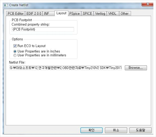 User Properties are in inches를 선택하고 NetlistFile에서 자신이 사용할 Netlist 파일 명을 입력 합니다.
