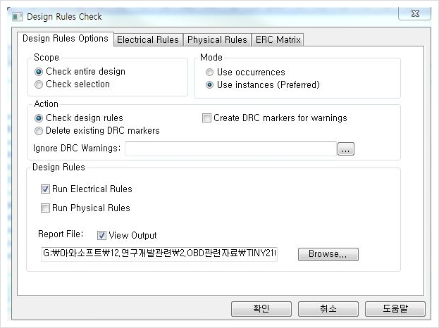 그러면 Design Rules Check 대화상자가 뜨게 됩니다. 여기서 다른 부분은 그대로 두고 Report에서 자신이 보기를 원하는 부분을 채크 표시하시면 됩니다. 그리고 아래쪽에 View Output에 체크 표시를 하고 확인을 누릅니다.