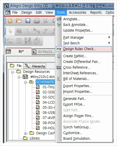 역시 프로젝트 창에서 Schematic을 선택하고 우측상단 툴바의 DRC를 누릅니다.