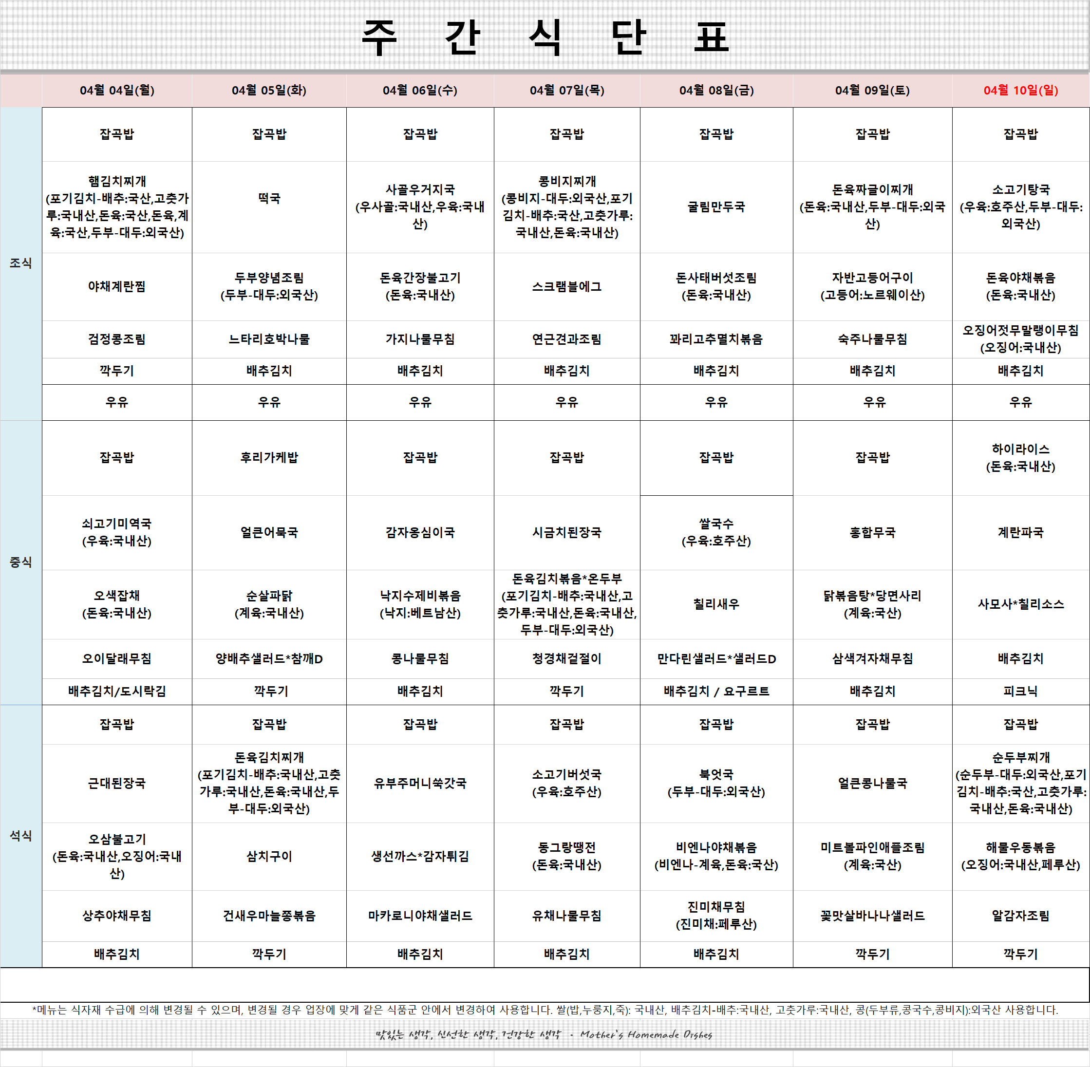 식단표(4월2주차) 작성자영양사 우지혜|작성시간22.04.04|조회수30 목록 댓글 0 글자크기 작게가 글자크기 크게가 다음검색 현재 게시글 추가 기능 열기 북마크 신고 센터로 신고 댓글 댓글 0 댓글쓰기 답글쓰기 댓글 리스트