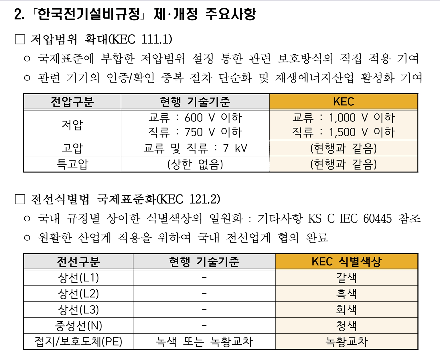 * 이렇게 변경된 이유는 반도체 산업의 발전에 따라 인버터 등이 개발되면서 이전의 기술기준이 불합리한 점이 반영되어 전압규정을 바꾸게 되었다. 또한 국제기준과 혼동되는 점 을 고려하여 상별 극성 식별 색상도 바뀌게 되었다.