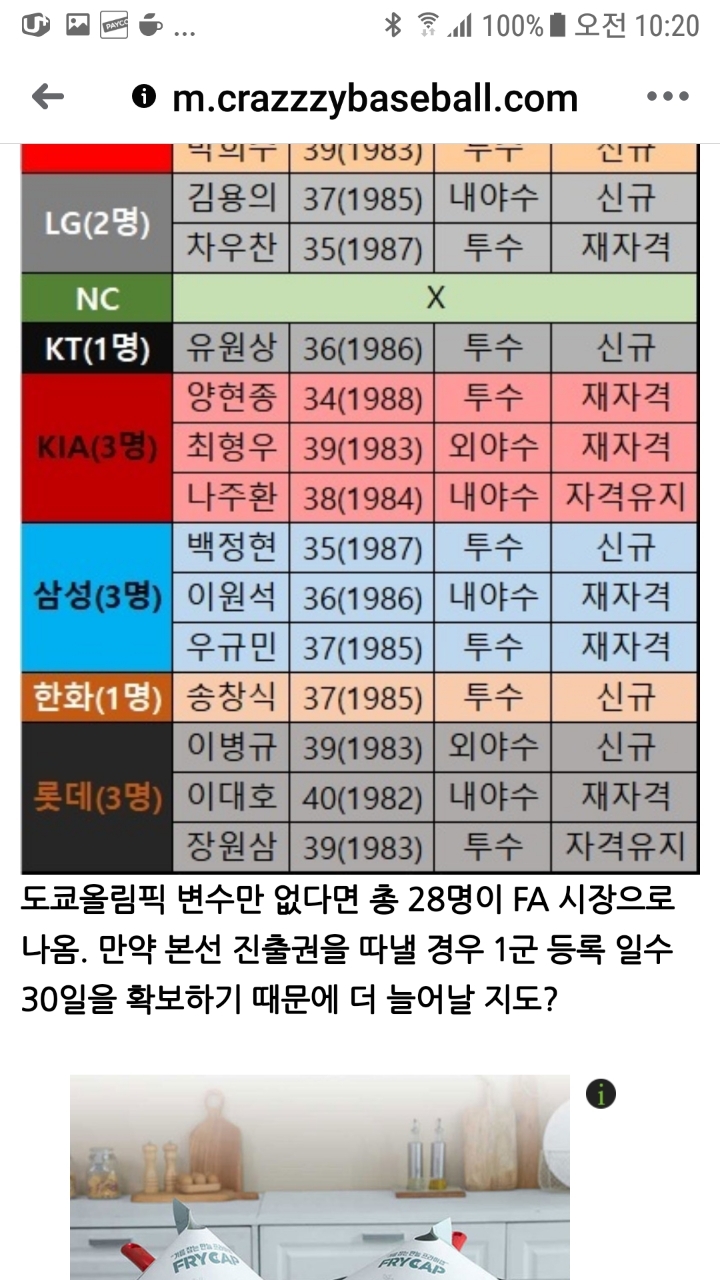 2021년 예비 fa명단 작성자타안이글스|작성시간20.01.08|조회수1,002 목록 댓글 3 글자크기 작게가 글자크기 크게가 ㅇㅇ 다음검색 현재 게시글 추가 기능 열기 북마크 신고 센터로 신고 댓글 댓글 3 댓글쓰기 답글쓰기 댓글 리스트 작성자메단이글스 | 작성시간 20.01.08 이용찬 허경민 정도...양현종은 안되겠죠? 작성자낯도깨비 | 작성시간 20.01.10 이용찬과 정수빈,그리고 양현종까지.. 작성자과감한 홈스틸!! | 작성시간 20.01.17 양현종이 왠만한 돈에는 안움직일거 같네요. 적정선에서 기아에서도 맞춰줄것 같고... 투수는 양현종 차우찬 외에는 땡기는 선수가 없네요. 댓글 전체보기