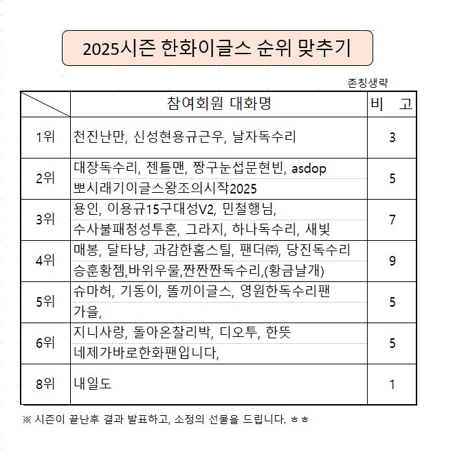 작성자날자독수리 작성시간 25.03.21 항상 1위를 생각하며 올해도 응원 열심히 해야겠네요! ^^