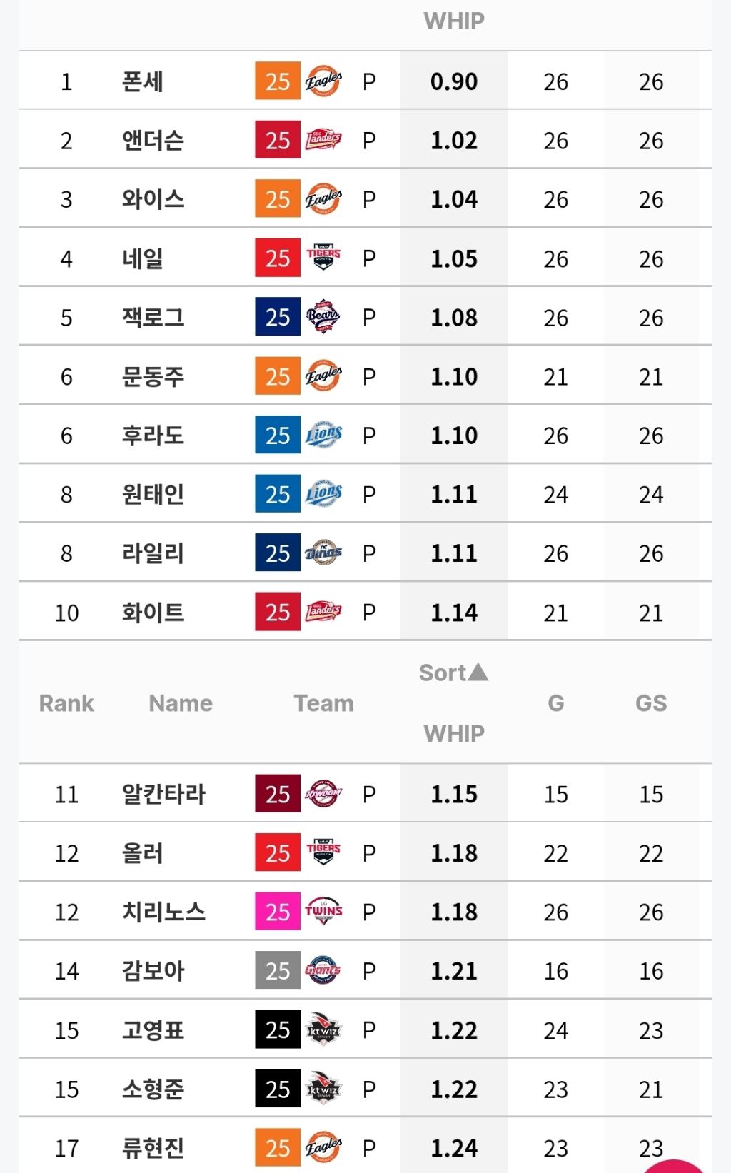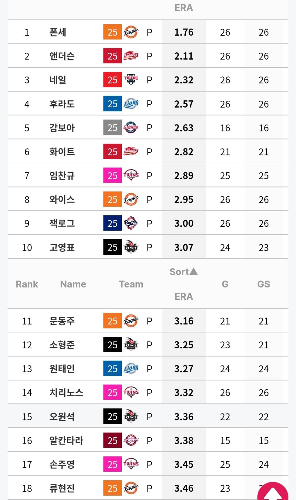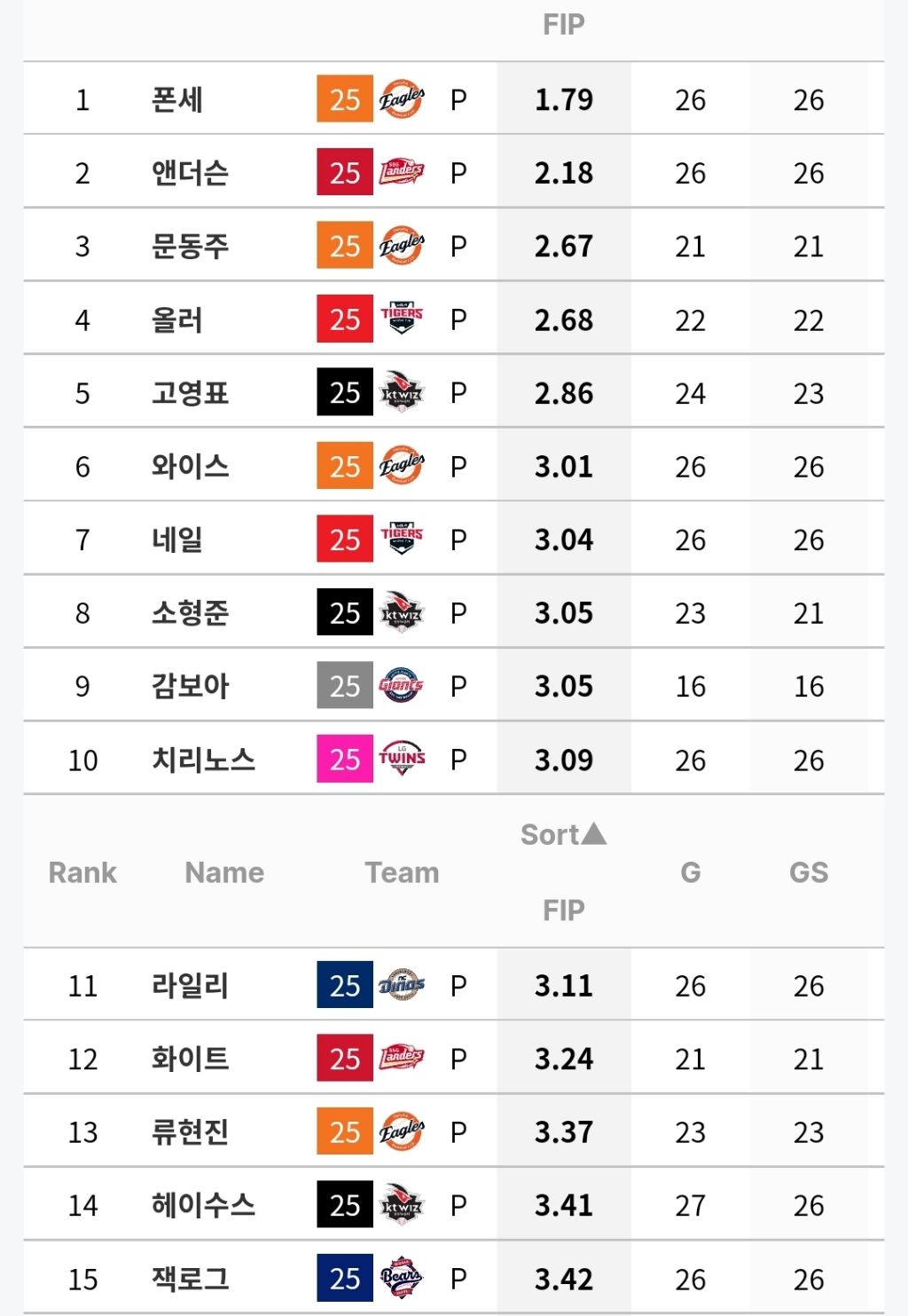 동주가 아쉽게 규정이닝은 소화못해서 기준은 규정이닝 70%기준입니다