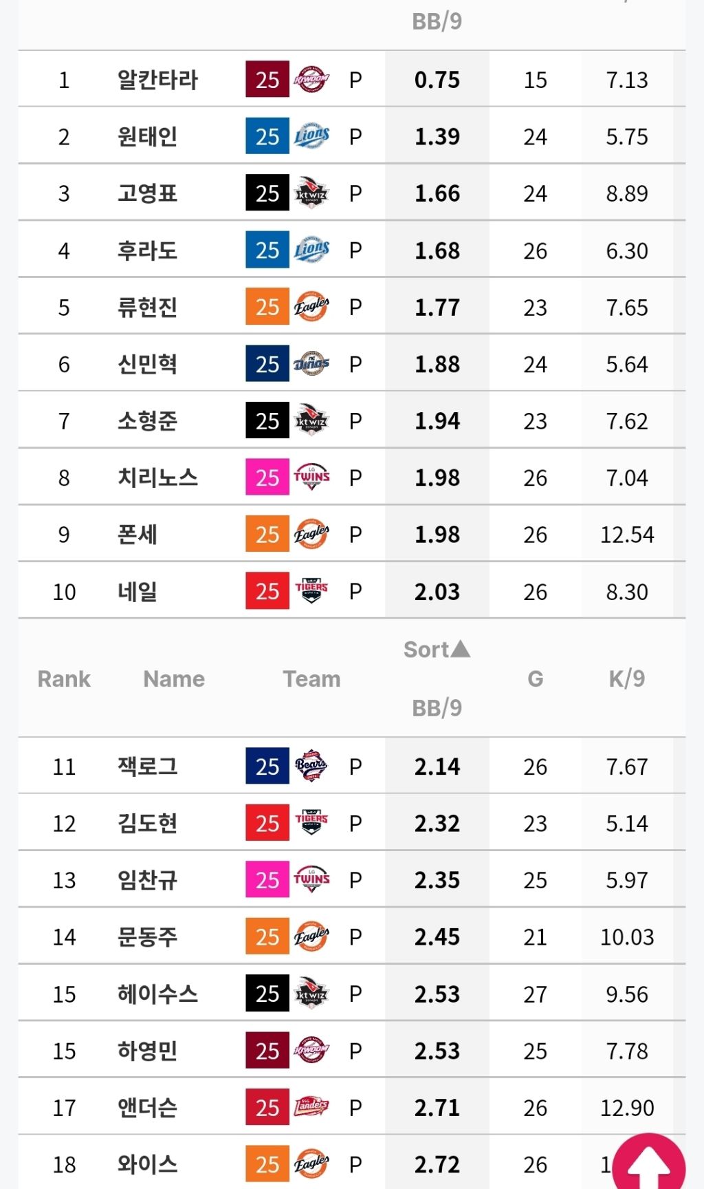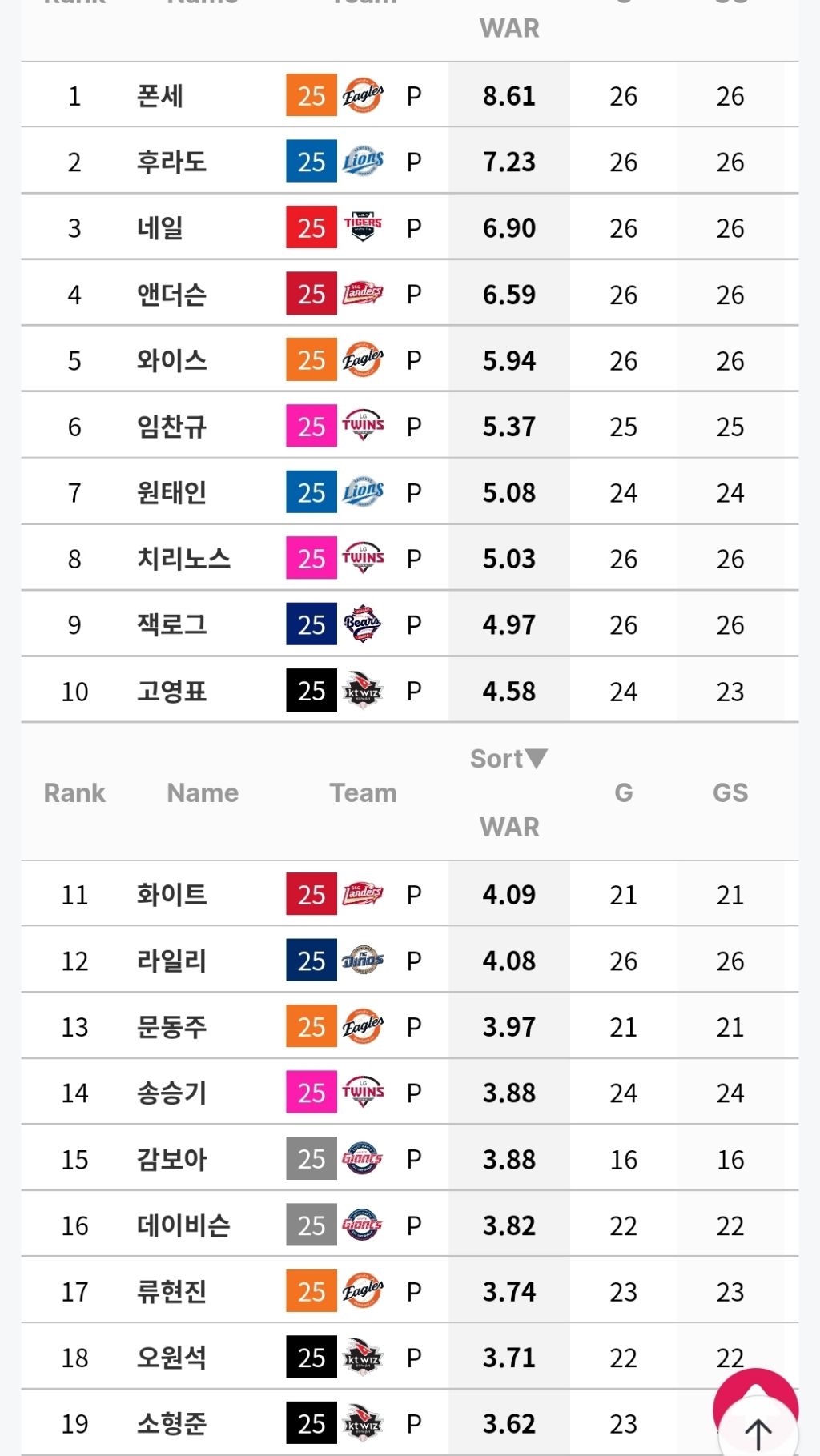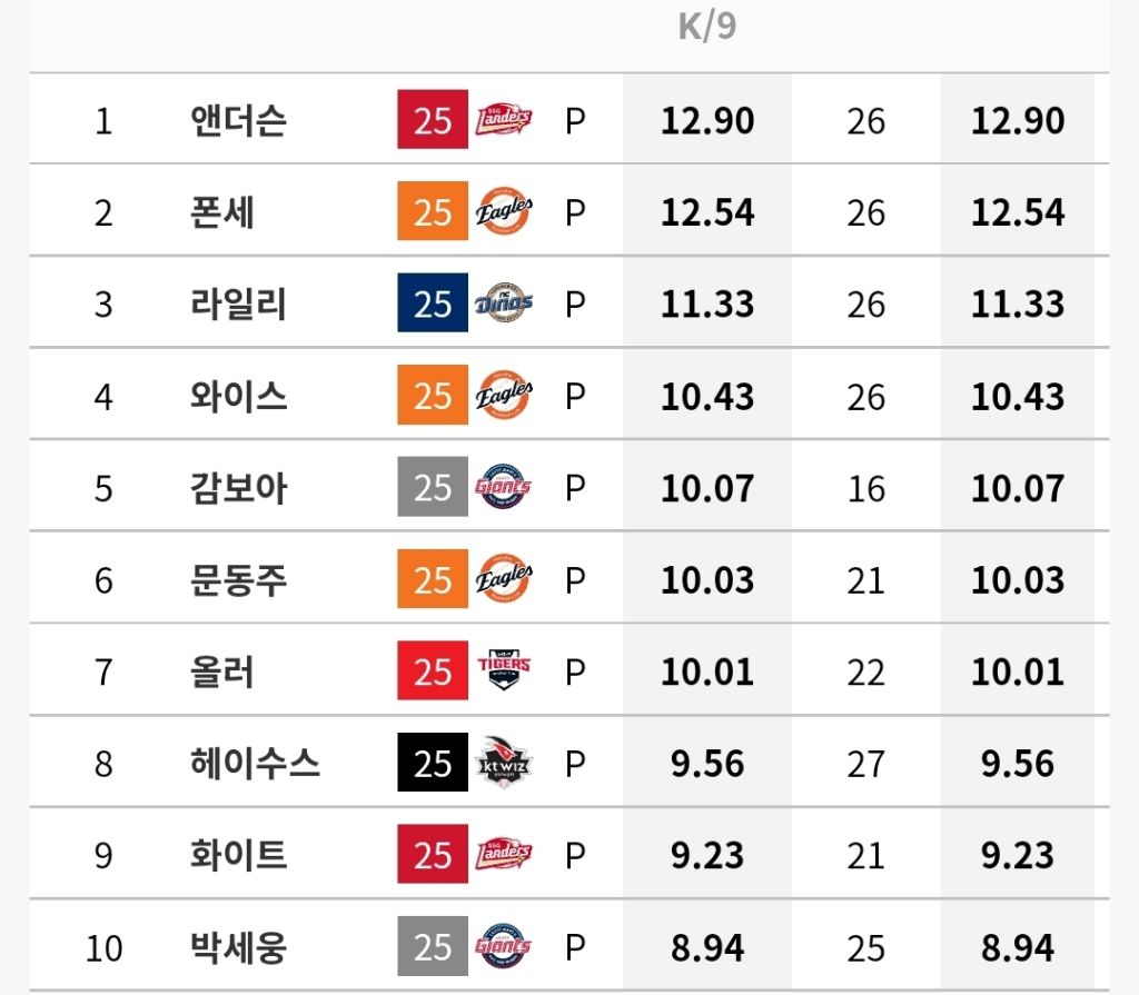 동주가 아쉽게 규정이닝은 소화못해서 기준은 규정이닝 70%기준입니다