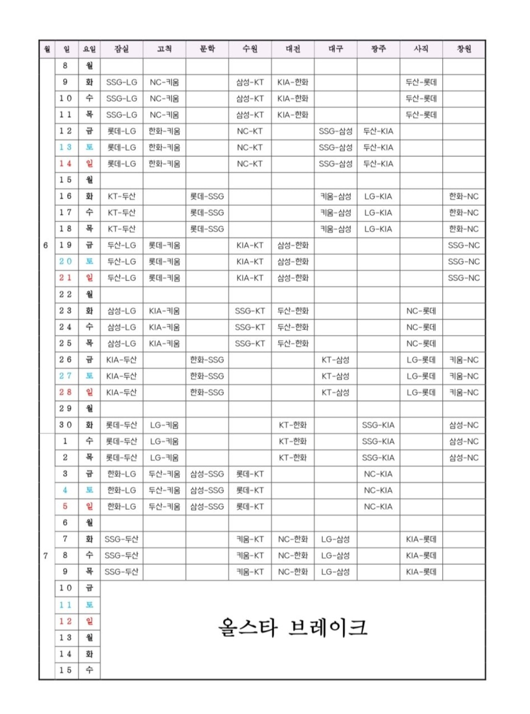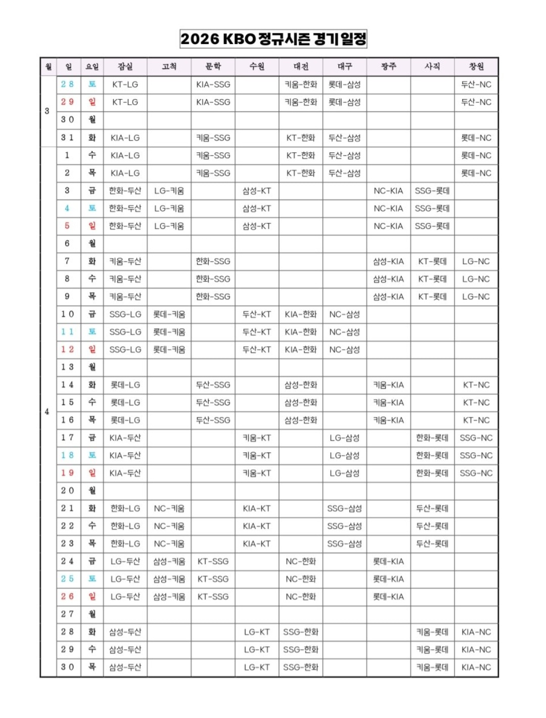 2026 KBO 정규시즌 경기일정 작성자데일리즈|작성시간25.12.19|조회수385 목록 댓글 2 글자크기 작게가 글자크기 크게가 다음검색 현재 게시글 추가 기능 열기 북마크 신고 센터로 신고 댓글 댓글 2 댓글쓰기 답글쓰기 댓글 리스트 작성자러브캣 | 작성시간 25.12.19 D-99 작성자엉덩이 | 작성시간 25.12.20 우리도 이제 개막전을 홈에서 보는군요ㅎㅎ홈 개막전 같은 말장난 말고 댓글 전체보기