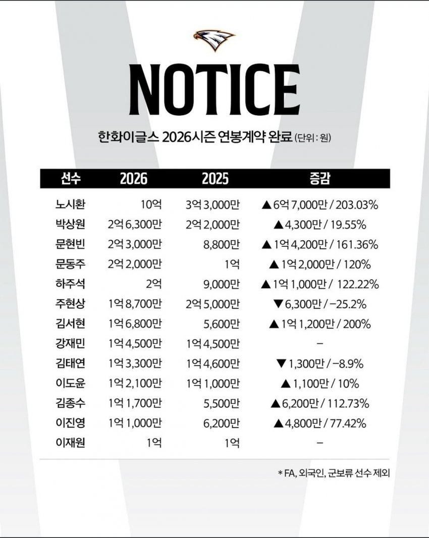 2026 한화이글스 선수단 연봉 계약 완료. 작성자승훈황젬|작성시간26.01.21|조회수542 목록 댓글 6 글자크기 작게가 글자크기 크게가 일단 주요선수들 연봉. 대충 예상한 금액과 다 비슷한데.. 하주석은 좀 적게 받는 느낌.. 지난해 1억1천만원이면.. 지난해 해준거 생각해서 이번시즌 3억까진 줘도 평균 2억선이라.. 괜찮았을건데... 다음검색 현재 게시글 추가 기능 열기 북마크 신고 센터로 신고 댓글 댓글 6 댓글쓰기 답글쓰기 댓글 리스트 작성자영원한 독수리팬 | 작성시간 26.01.21 하주석은 좀 아쉽네요문현빈, 김종수는 과하게 준거같고노시환은 번외네요 작성자윈나우이글스 | 작성시간 26.01.21 억대 연봉자만 공지하고 나머지 선수들은 비공개인가요??? 답댓글 작성자승훈황젬 작성자 본인 여부 작성자 | 작성시간 26.01.21 아마 인스타쪽으로 다 공개할거 같아요 작성자배지타 | 작성시간 26.01.22 도윤이 좀 더 챙겨 주지 아쉽네요 작성자★이용규15구대성☆V2 | 작성시간 26.01.28 도윤이 주석이가 아쉽겠어요 댓글 전체보기