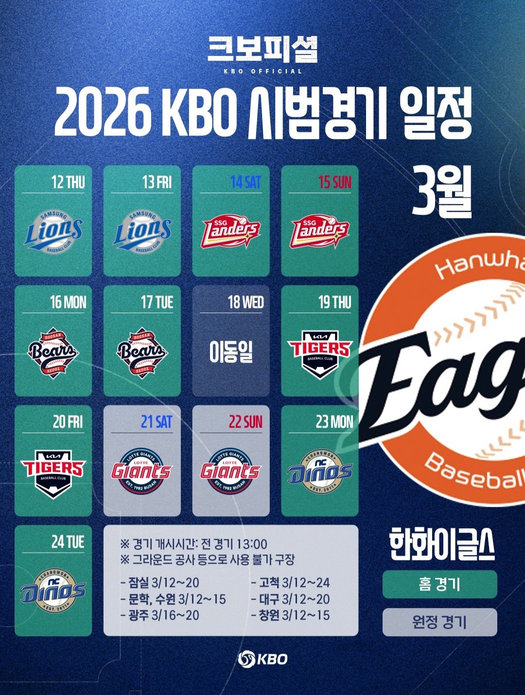 2026 KBO 시범경기 일정 작성자데일리즈|작성시간26.02.04|조회수365 목록 댓글 1 글자크기 작게가 글자크기 크게가 다음검색 현재 게시글 추가 기능 열기 북마크 신고 센터로 신고 댓글 댓글 1 댓글쓰기 답글쓰기 댓글 리스트 작성자구거로 | 작성시간 26.02.07 감사합니다. 댓글 전체보기