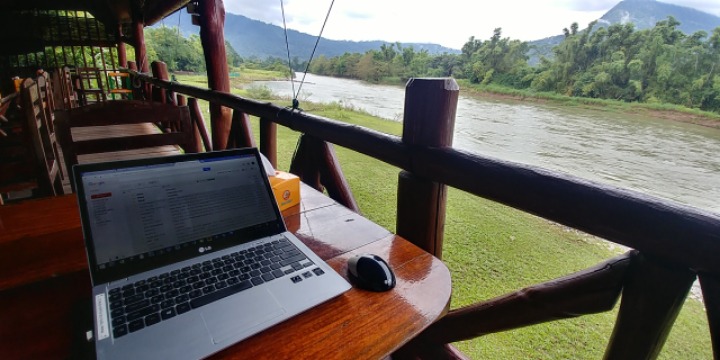 강변에 있는 숙소에 일찍 돌아와서 노트북으로 일을 본다.