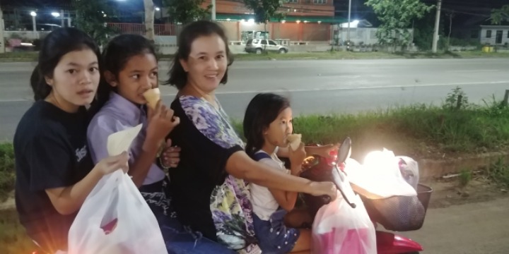 저녁시간에 만난 오토바이위의 일가족. 기념비적인 사진이다.