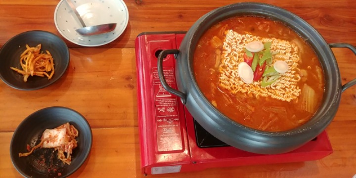 I ordered pork stew with kimchi and ramyon noodle. I ate two bowls of rice.
