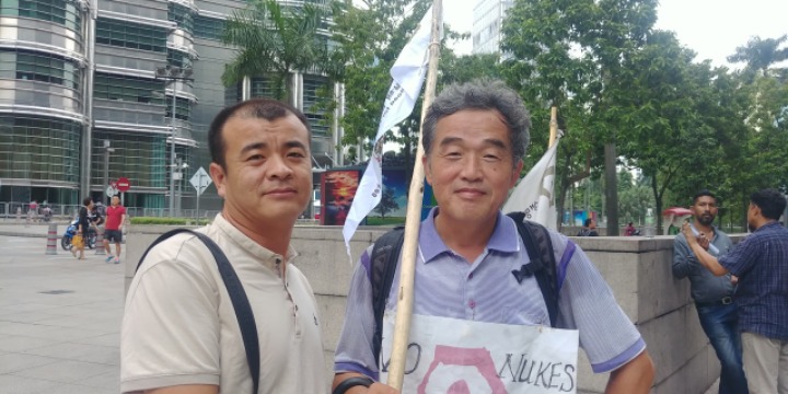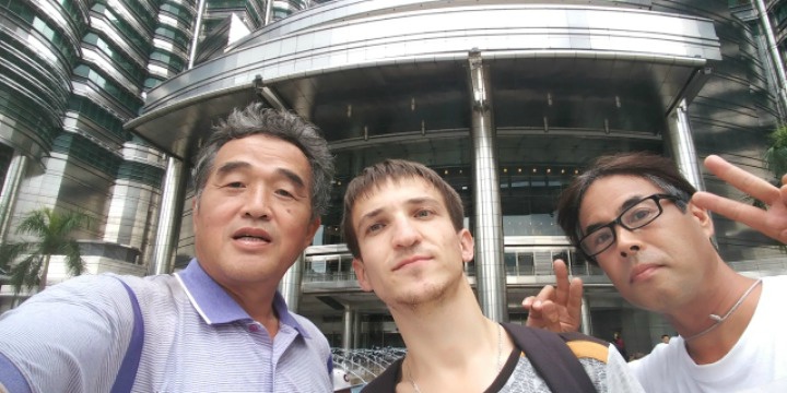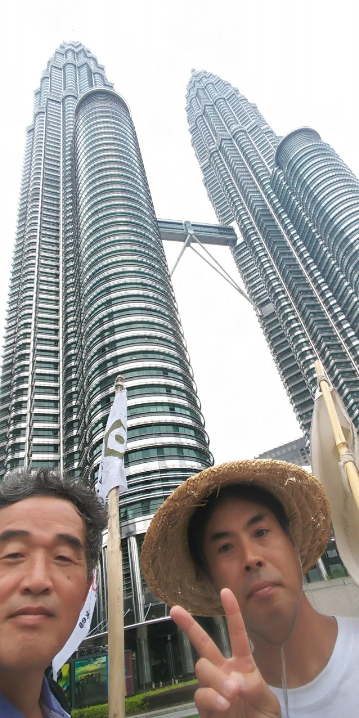 Mr. Hara took a black-and-white picture of me explaining silk road to the Malaysians in front of Twin Building.
