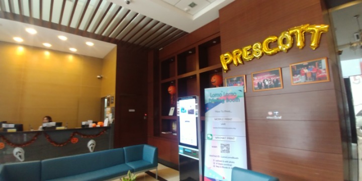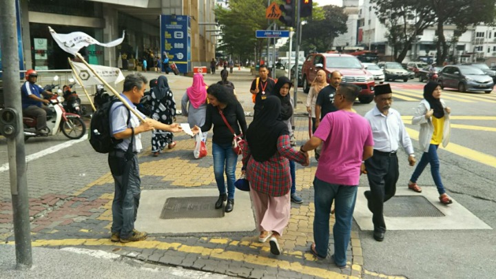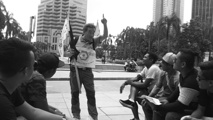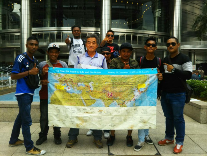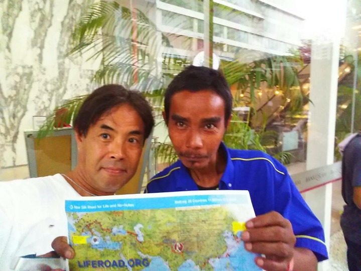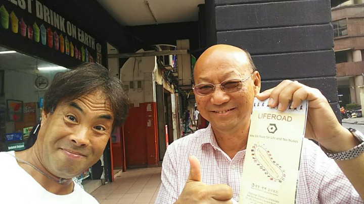 빌딩앞에서 만난 말레이시아인들에게 실크로드를 설명하는 장면을 하라상이 흑백으로 찍었다.