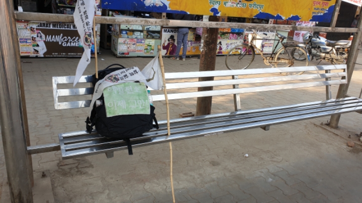 손에 들고 다니는 깃대 겸 지팡이는, 부처님이 제자를 길러내신 영축산이 있는 라즈기르(Rajgir)에서 어린 소녀로부터 산 것이다.