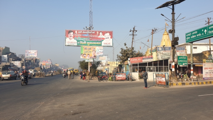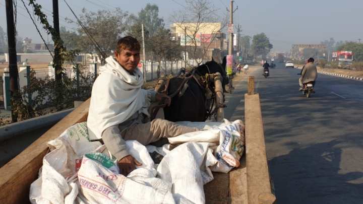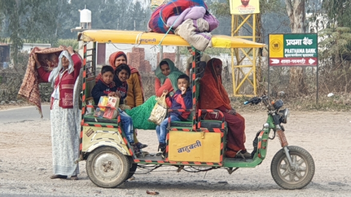 20. 길건너 오토릭샤에 일가족으로 보이는 사람들이 짐을 싣고 타고 있다. 인도다운 풍경이다.