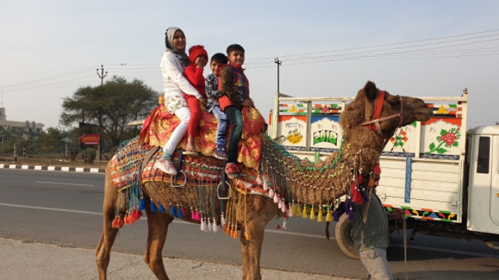 24. 이 거리에서 제공하는 낙타를 체험하고 있는 가족들.