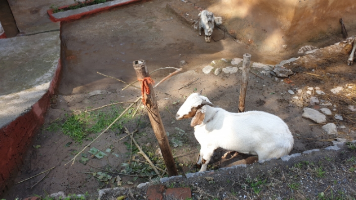 A branch of tree which goats like is put across as food between meals.