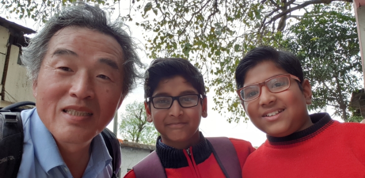 Twin primary schoolers with curiosity approached me. I took a picture with them.
