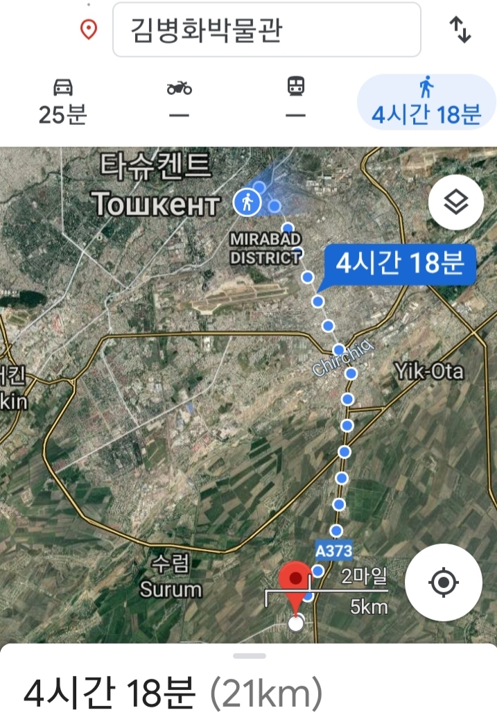 1. 숙소가 있는 타쉬켄트역으로부터의 거리는 21km다. 걸어서 갈 만하다.