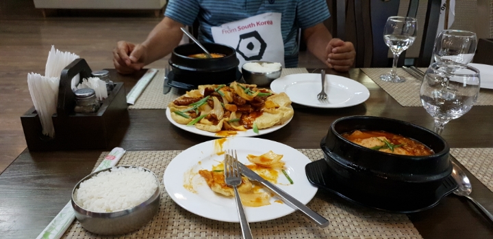 20. 한국 떠난지 닷새째여서 맛있게 먹었다.김치찌개 2인분과 두부제육복음을 먹었는데 우리돈으로 2만원이 채 못 되었다.