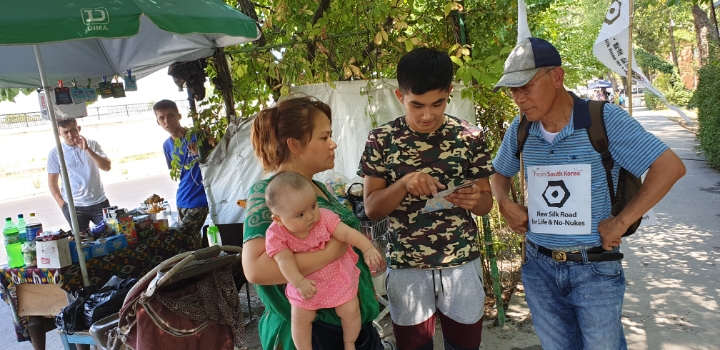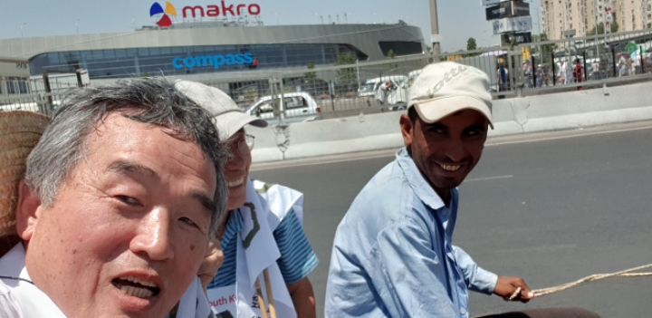 3. We started to walk. Prof. Lee Sang Hoon joined in Central Asia pilgrimage. The building in the back is Tashkent station.