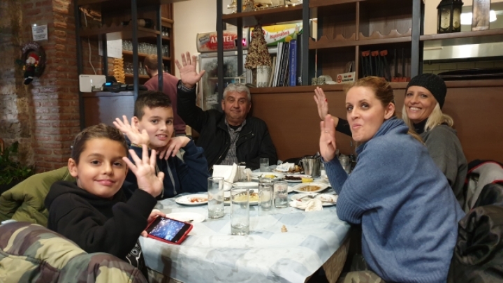 38. 생선요리를 하는 맛집을 찾았더니 손님들이 꽉찼다. 옆테이블에 있는 가족들이 미소로 반겨준다.