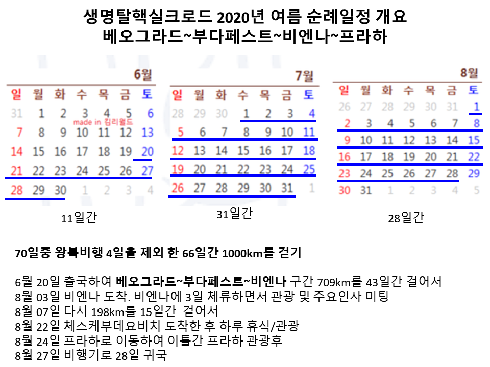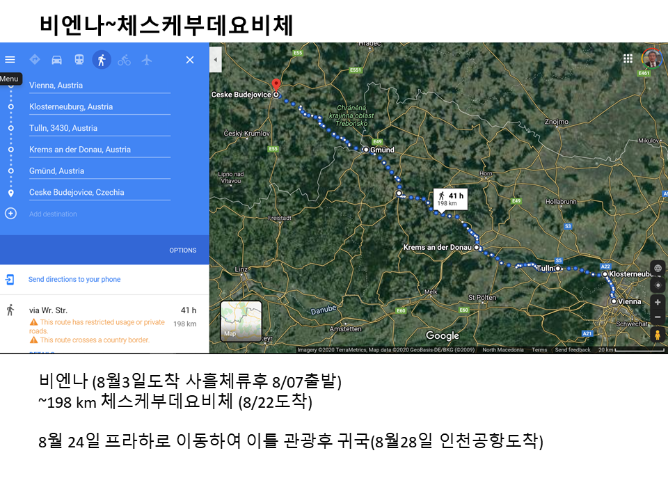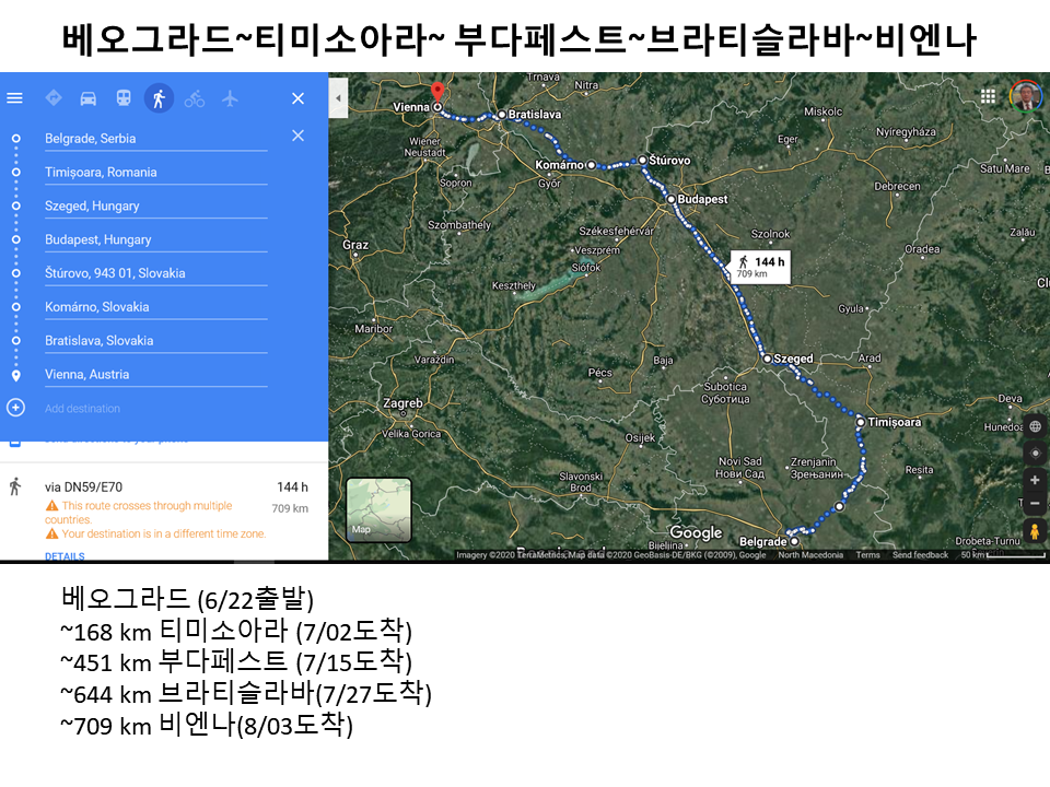 I leave Incheon on June 20 and walk 709 km Bograde - Budapest - Vienna course for 43 days.