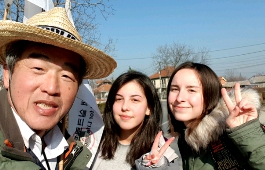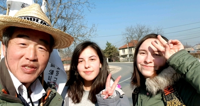 손을 흔들며 인사한 후 필자가 가슴의 벽보를 가리키면서 South Korea 라고 하니 놀라면서 환호한다.