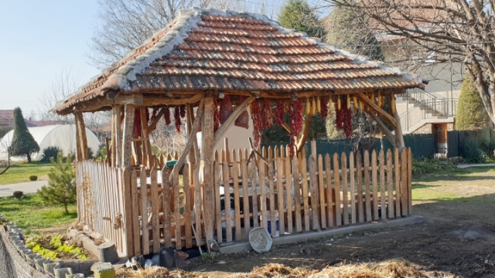 22. 농가의 원두막에 옥수수 피망 마늘 등 종자용 열매를 매달아 보관하고 있다.
