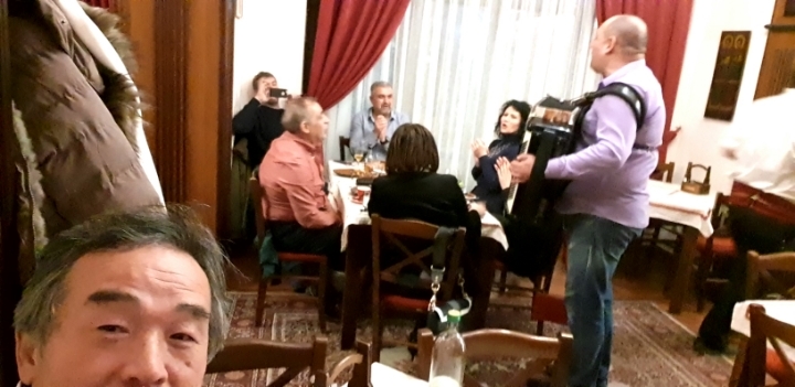 31.옆좌석에서 아코디언와 함께 흥겹게 노래를 부르고 있다.