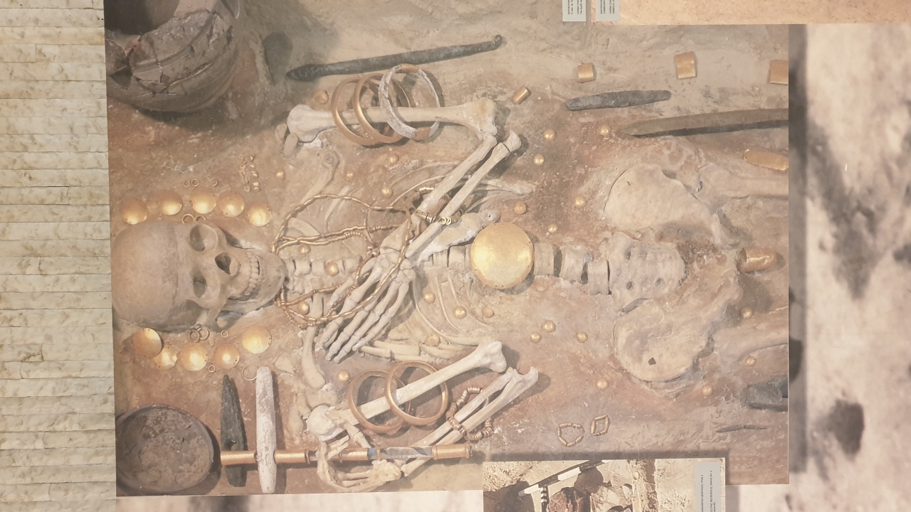 40. 출토된 옛무덤에서 귀금속의 장신구를 있는 그대로 살려서 전시한 장면이다.