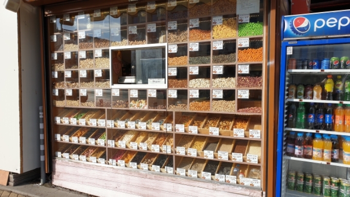 18. 간식의 과자를 파는 진열대.