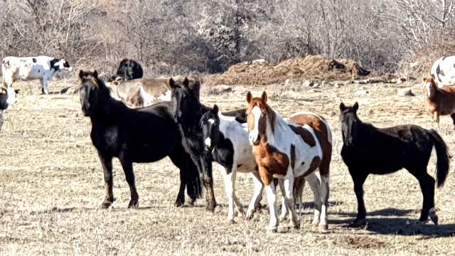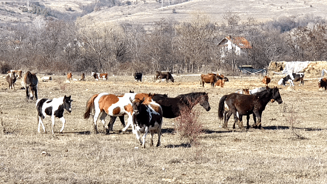 31. 소와 말들이 사이 좋게 어울려 있다.