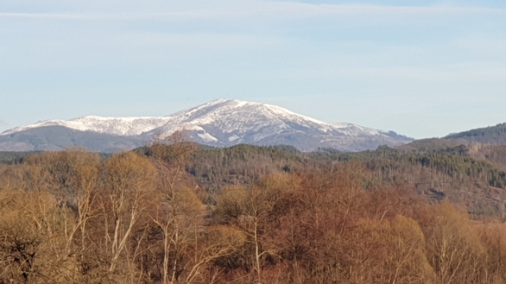 48. I took this picture by zoom-in. It is very symbolic picture having white mountain and quiet village and flat land.