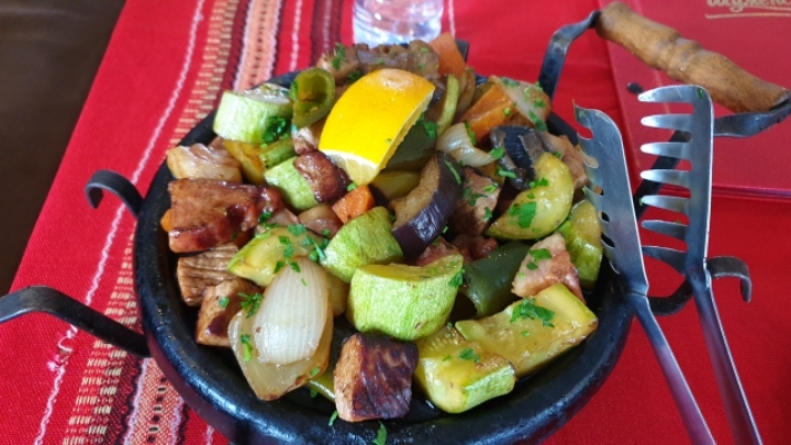 20. 점심때 먹은 불가리아 요리. 돼지고기를 각종채소와 함께 후라이팬에 구워낸 것이다. 푸짐하거니와 맛도 일품이다.