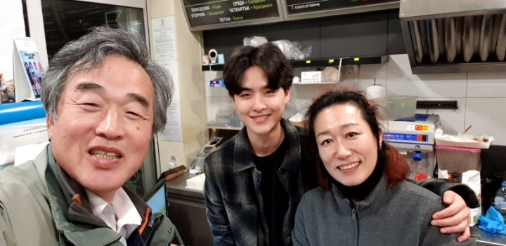 A selfie with the owner on the right and the Korean backpacker who works as a part-timer.