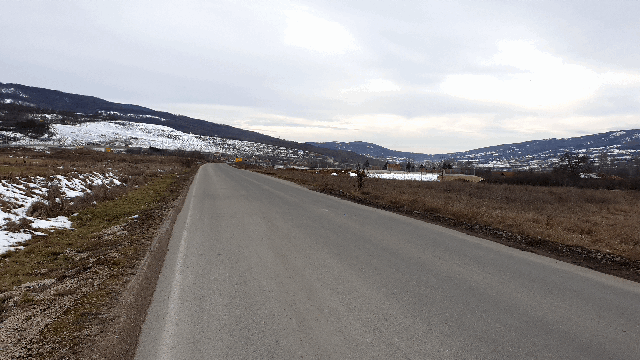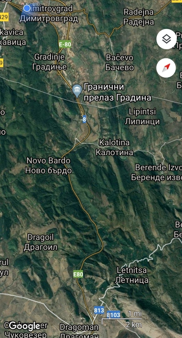 맨아래 Dragoman에서 위쪽 2/3 쯤 있는 흰 선의 국경까지가 14km이고, 국경부터 맨위의 파란 점이 있는 Dimitrovgrad까지가 5km다.