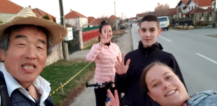 I met the teenagers on their bikes. They look like middle school students. They speak English. I explain them with pamphlets.
