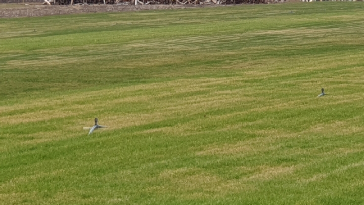 36. 잔디를 스프링 쿨러로 키우고 있다.