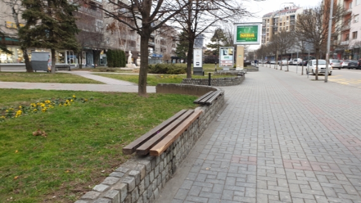 40. 시내도착. 화단옆에 간단히 나무를 얹어놓은 벤치.