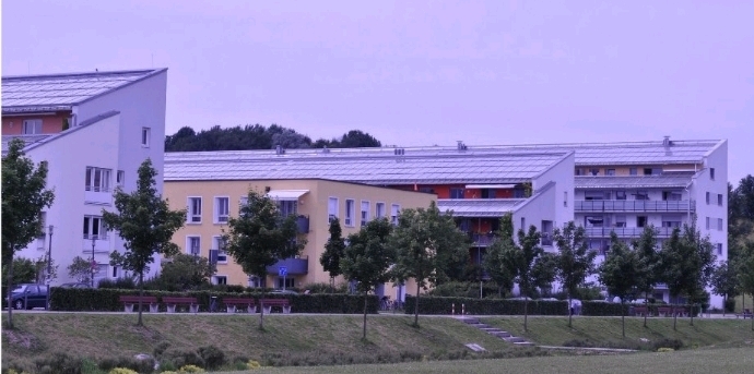 Even in apartment houses, the entire roof can be installed with solar panels. The photo is an apartment complex near Munich.