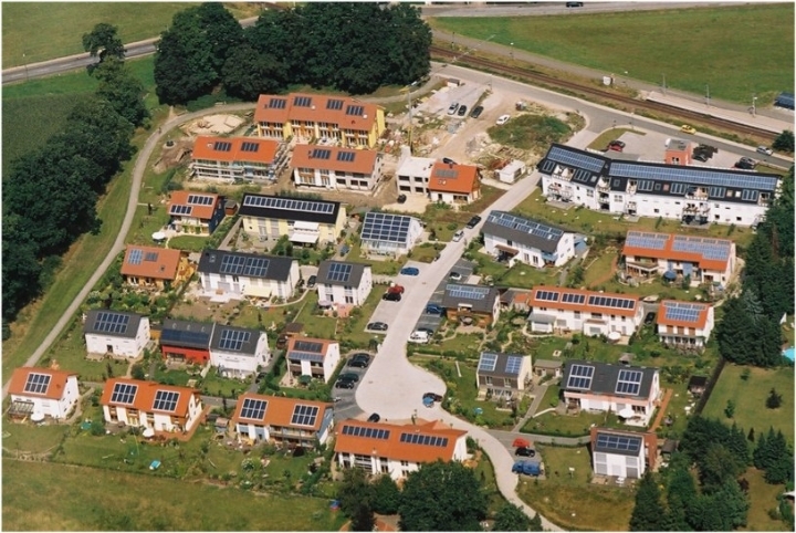 The picture is a residential complex in Bilefeld, Germany. It is a joint residential design that maximizes the efficiency of solar panel installation in relaxed manners.