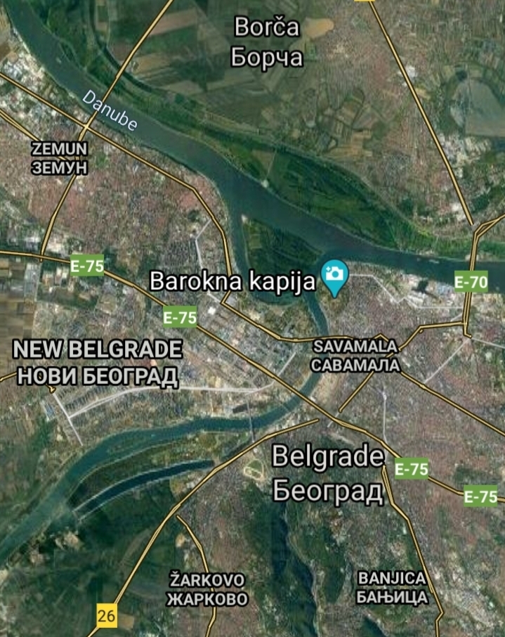7. 오른쪽 아래 귀퉁이의 Saint Sava 성당으로부터 일직선으로 시내를 비스듬하게 가로 지르는 길이 나있다. 그 길은 방향은, 그의 이름을 딴 Sava강이 Daube강과 합류하는 지점을 향하여 있다.