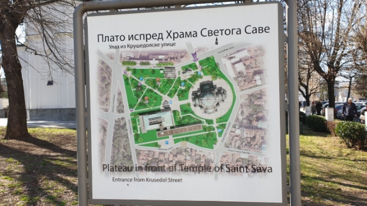 There is a road that crosses the city at an angle straight from Saint Sava Cathedral in the lower right corner. The direction of the road, named after Saint Sava, faces the point where the Sava River joins the Daube River.