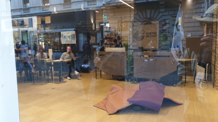Walking through the city, passing through a window displaying old typewriters.