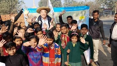 smiles with children during his pilgrimage in India. Courtesy of Lee Won-young