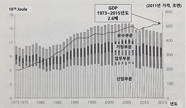 일본에서의 에너지소비 추이(일본 자원에너지청 자료). 52개 원전(핵발전소)의 가동이 올스톱 되다시피한 2011년~2015년에 GDP는 오히려 증가했음을 볼 수 있다.