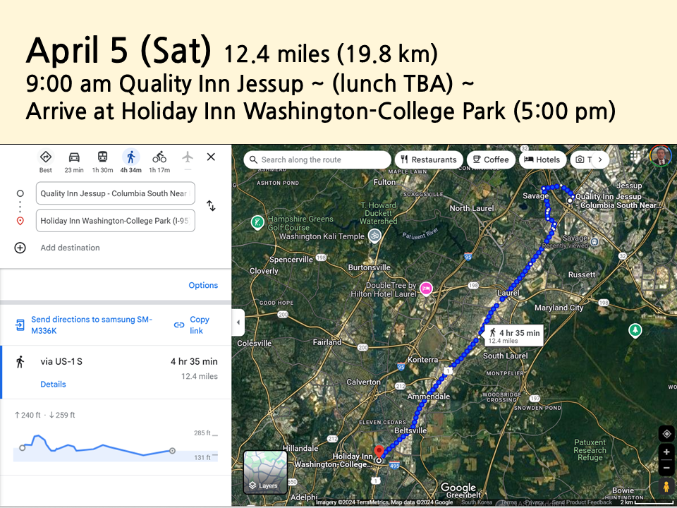 이곳에서 내일까지 쉬고 모레 4월7일(월) 워싱턴DC시내를 거쳐 유니온역(오후4시 도착예정)까지 걷는다.