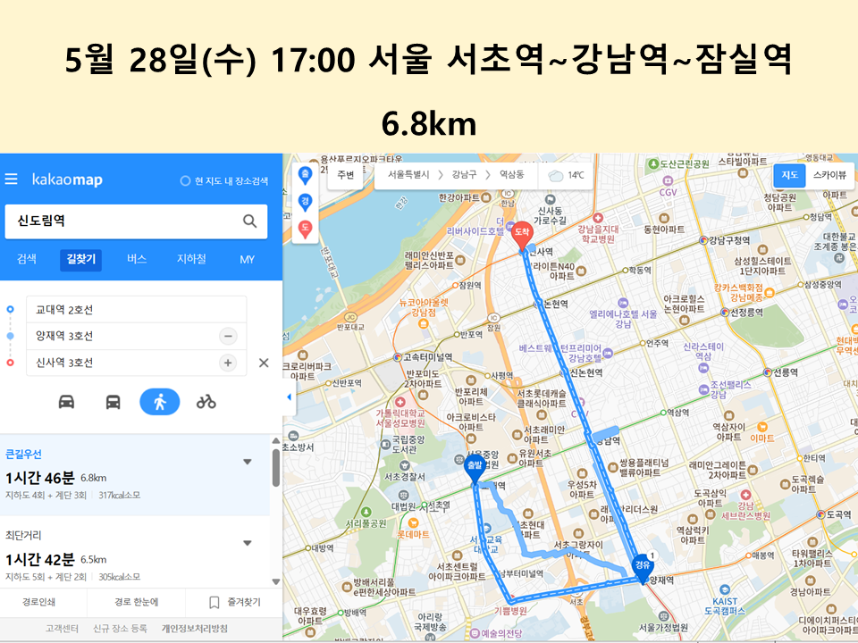 | 28 | 수 | 서울 | 17:00 교대역~양재역~강남역~신사역 | 6.8 |